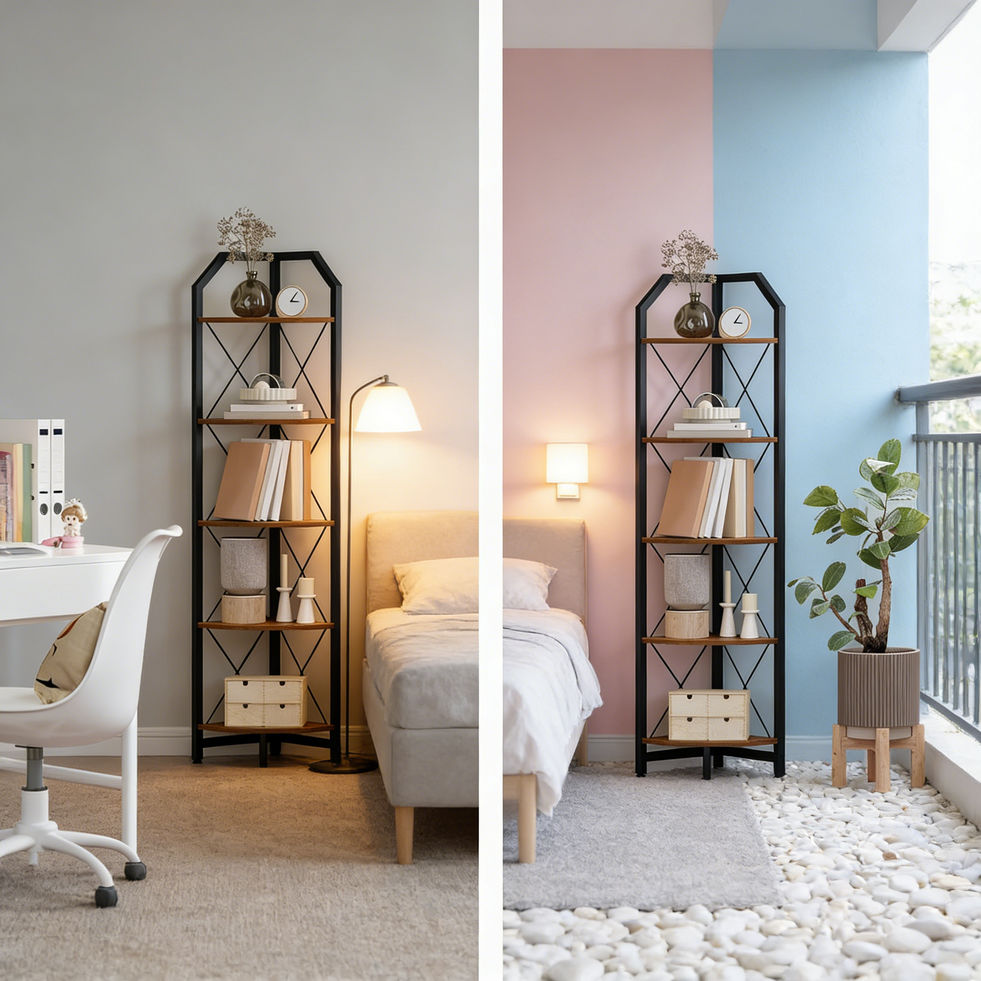 - Multifunctional Storage: The corner storage shelf boasts 5 spacious shelves, perfect for storing cherished book collection. Additionally, it can serve as a mini pantry in the kitchen or display your beloved photos, plants, and art pieces in the living room